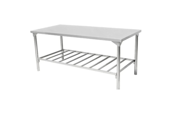 Mesas de inox robustas, perfeitas para cozinhas profissionais e industriais.